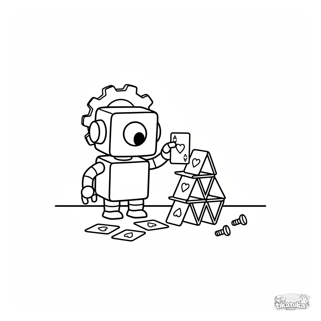 Página simple para colorear para bebés 2-3 años: un robot pequeño con cabeza de engranaje construye una torre de cartas. Formas grandes, detalles mínimos.