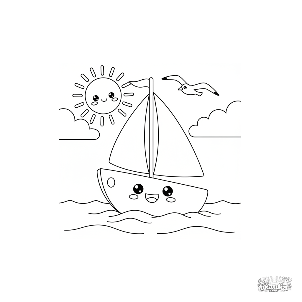Página para colorear para niños 4-6: un lindo velero con cara sonriente navega por un vasto y tranquilo océano bajo un sol brillante. Escena brillante y amigable.