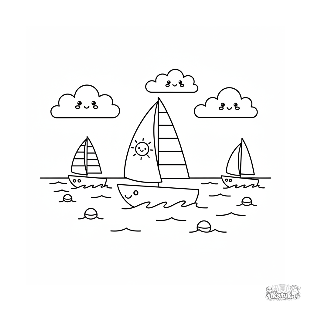 Página para colorear para niños de 4-6 años: tres pequeños veleros compiten en un lago soleado. Formas simples y planas.