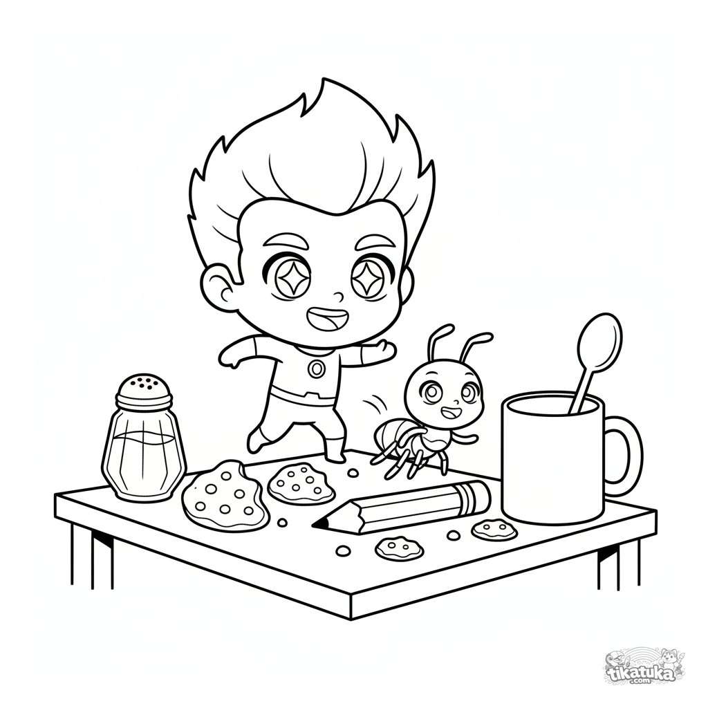 Página para colorear para niños de 4-6 años: un superhéroe diminuto explora una mesa de cocina gigante con una hormiga compañera.