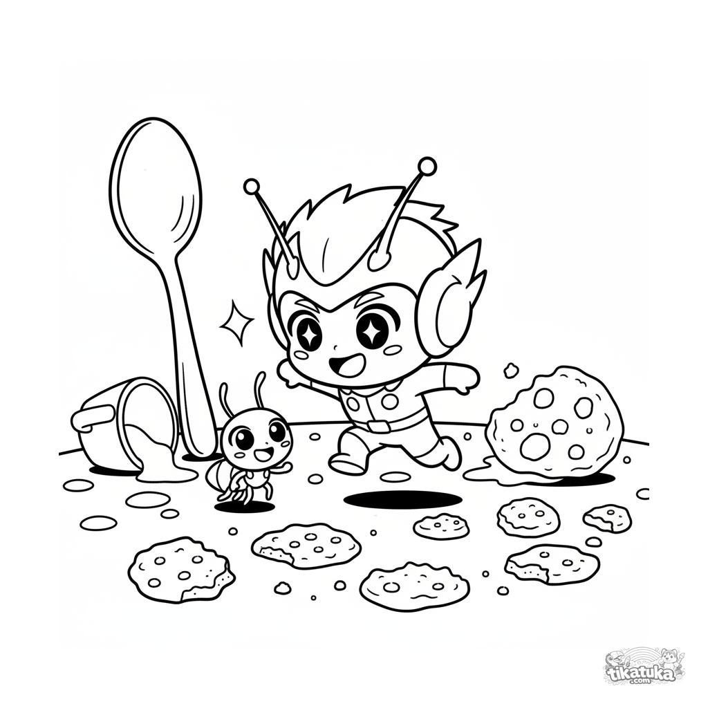 Página para colorear para niños 4-6: un superhéroe diminuto en traje amarillo salta por una mesa de cocina gigante con una hormiga compañera. Divertida aventura.