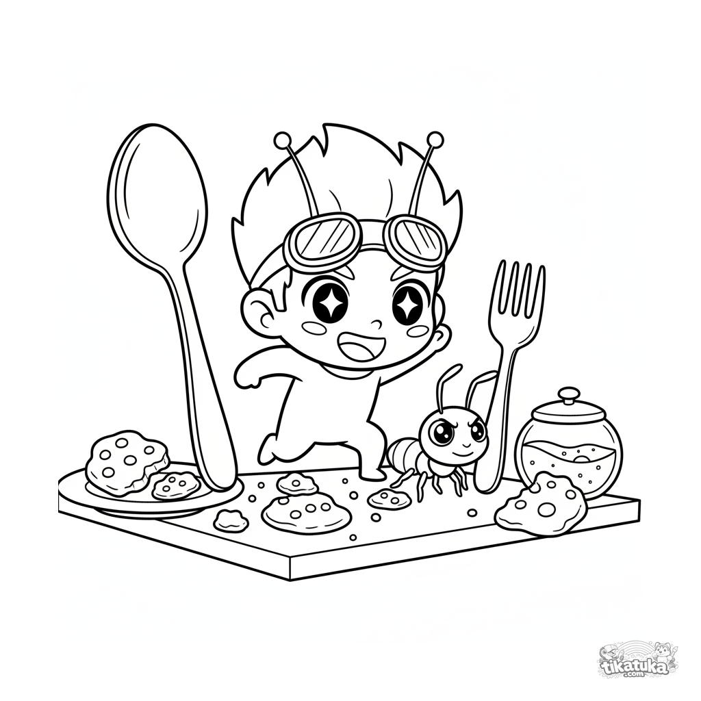 Página para colorear de un héroe diminuto saltando por una mesa de cocina gigante con una hormiga compañera. Para niños de 4 a 6 años.