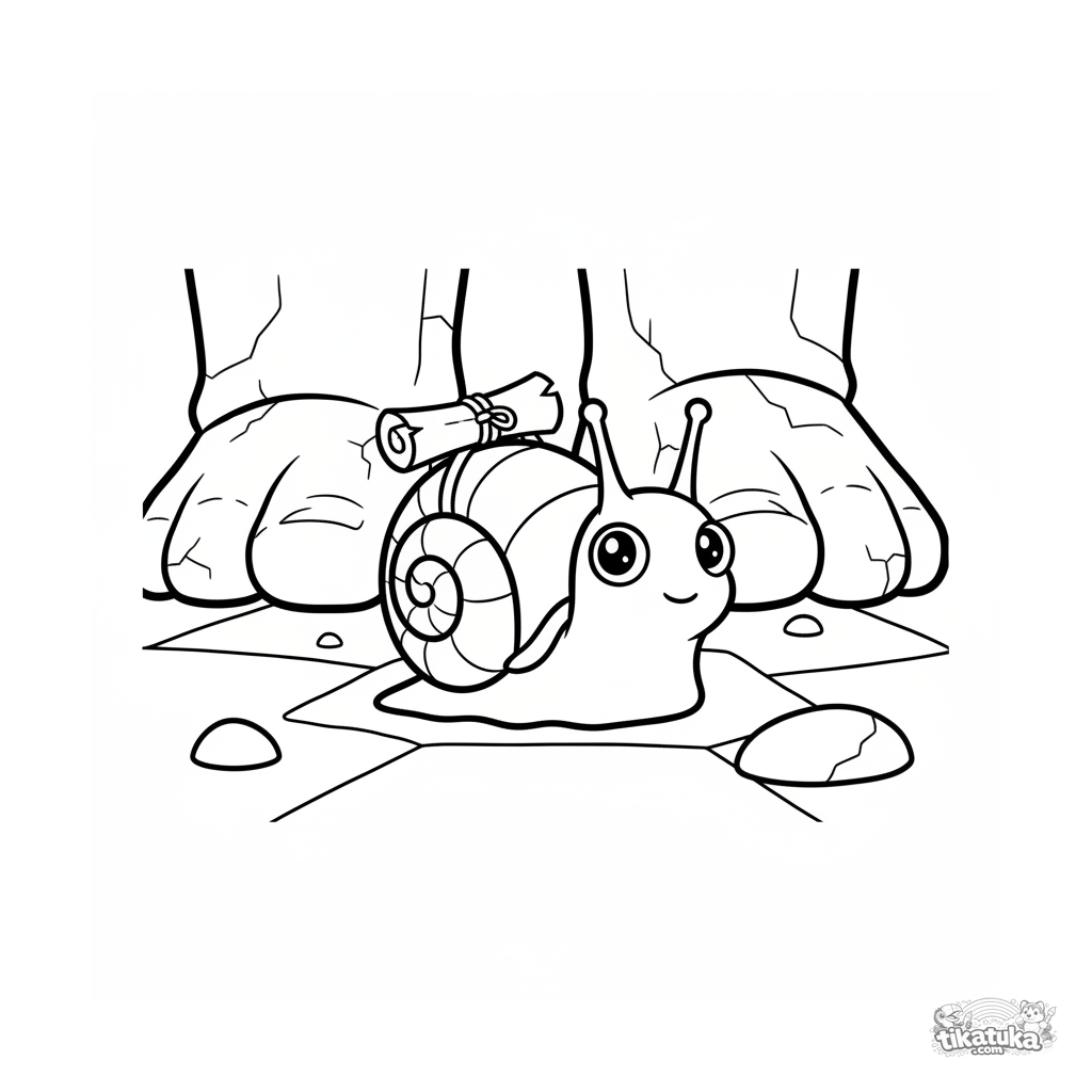 Página para colorear simple para niños pequeños de 2-3 años: un caracol lindo con un mensaje cruza el suelo de la cueva de la Gorgona.
