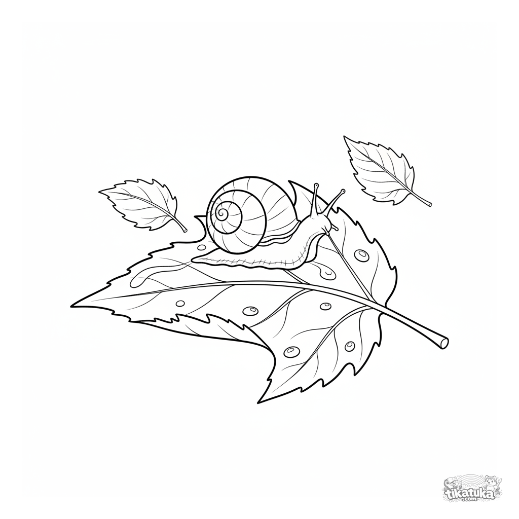 Página para colorear para niños 4-6: un caracol pequeño se arrastra sobre una hoja de arce mojada después de la lluvia. Detalles del caparazón, gotas de agua, escena natural.