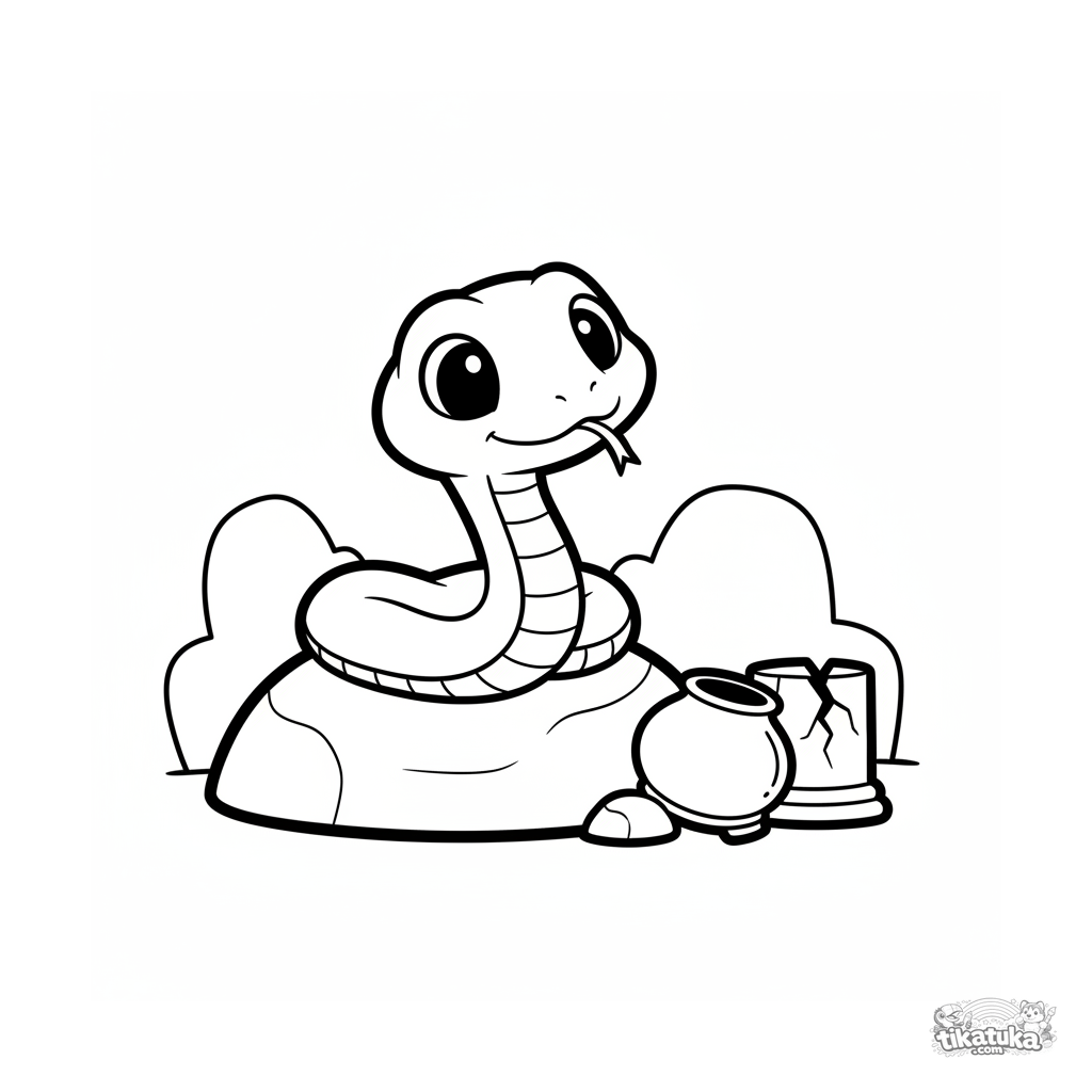 Página simple para colorear para niños pequeños 2-3 años: linda serpiente del cabello de Medusa en una guarida de piedra. Formas grandes y claras.