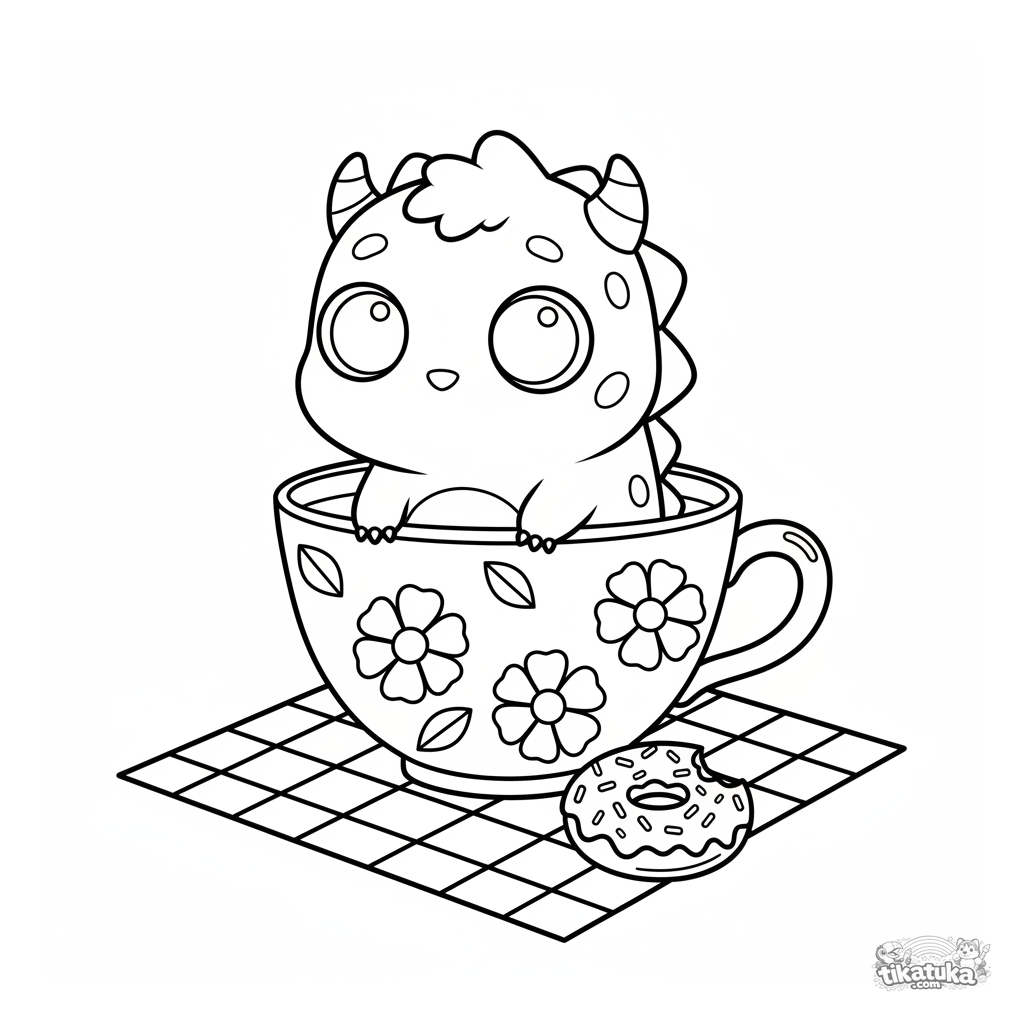 Página para colorear para niños de 4-6 años: un monstruo pequeño y espinoso asomándose de una taza de té en un picnic. Estilo anime-chibi tierno, escena simple.