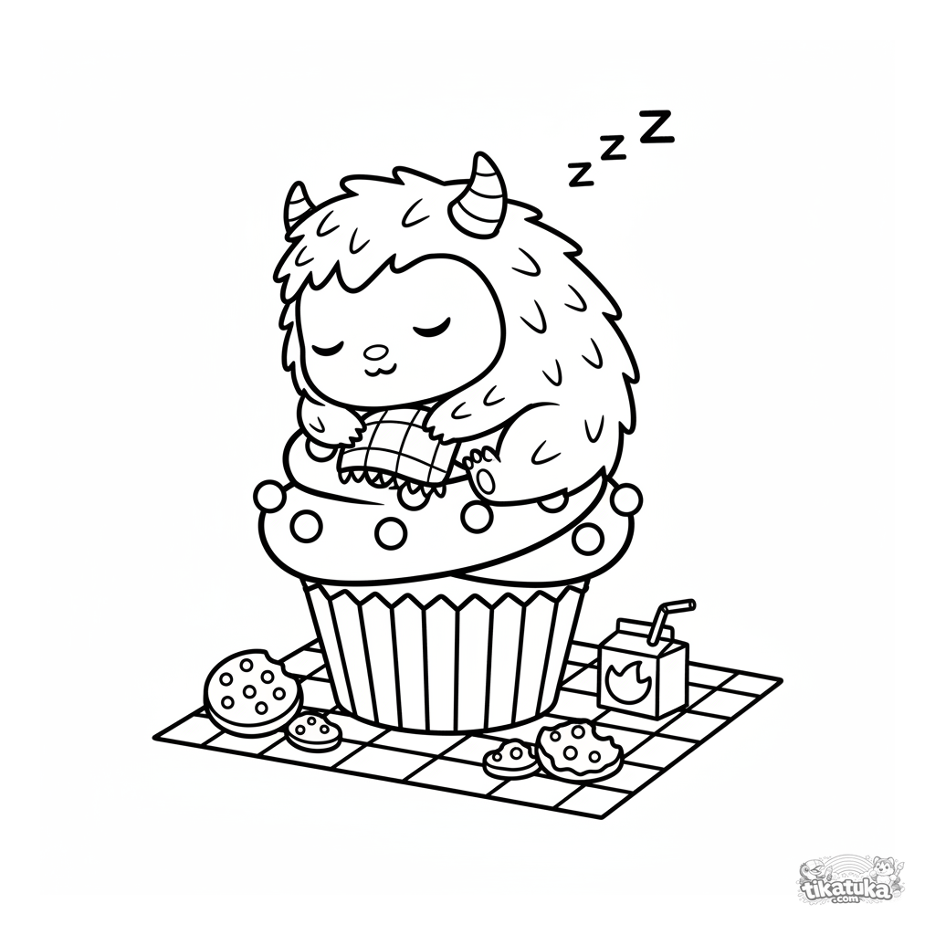 Página para colorear para bebés: un monstruito espinoso durmiendo profundamente en un cupcake gigante en un picnic. Formas simples para 2-3 años.
