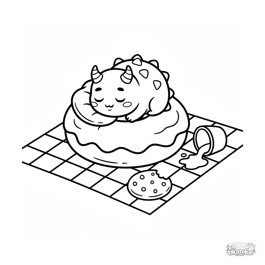 Página simple para colorear para bebés 2-3 años: un monstruito espinoso duerme profundamente en un donut gigante de jalea en un picnic. Formas grandes, pocos detalles.