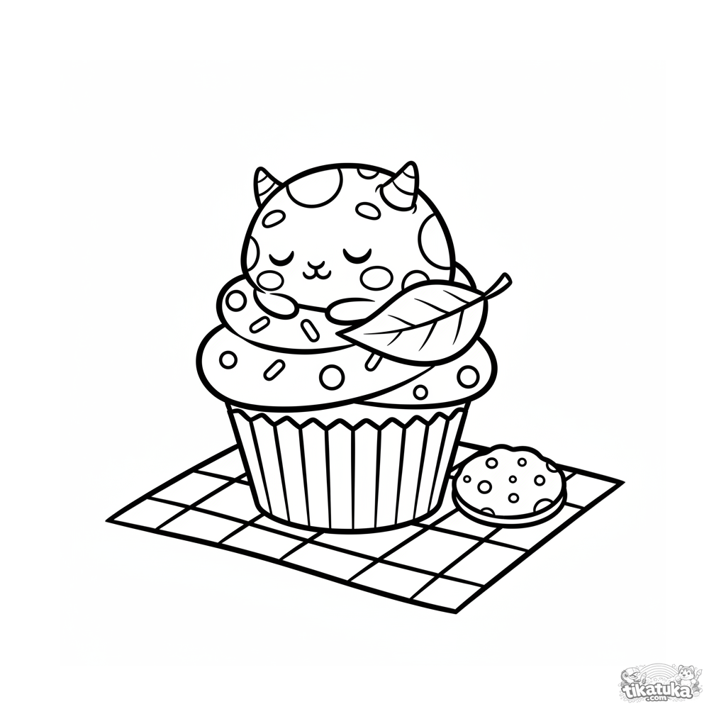 Página simple para colorear para niños de 2-3 años: un monstruito durmiendo en una magdalena gigante en un picnic. Formas grandes y contornos claros.