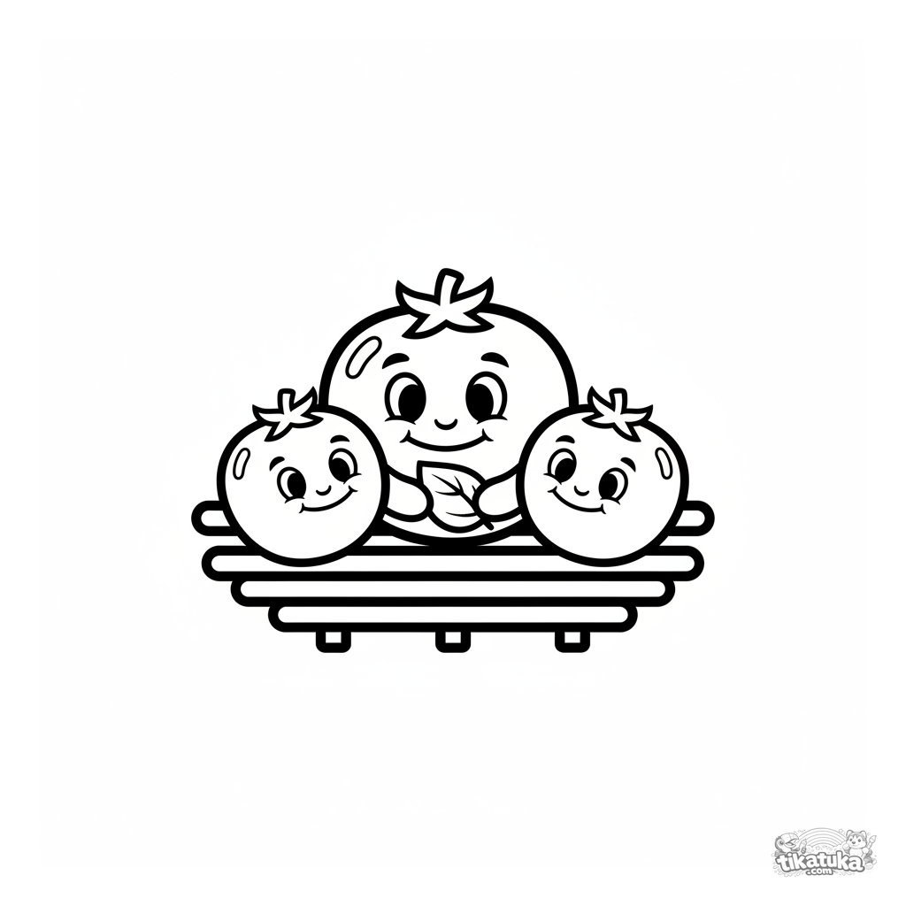 Página para colorear para niños pequeños 2-3 años: una familia de tomates cherry sonrientes en una parrilla de jardín.