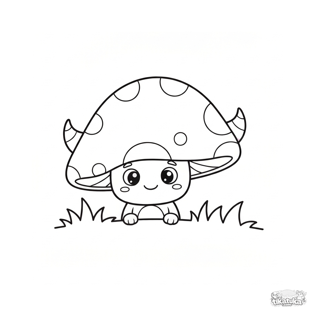 Página para colorear para niños de 2-4 años. Monstruito con dos cuernos asomándose detrás de una gran seta con manchas sobre hierba. Descarga gratis.