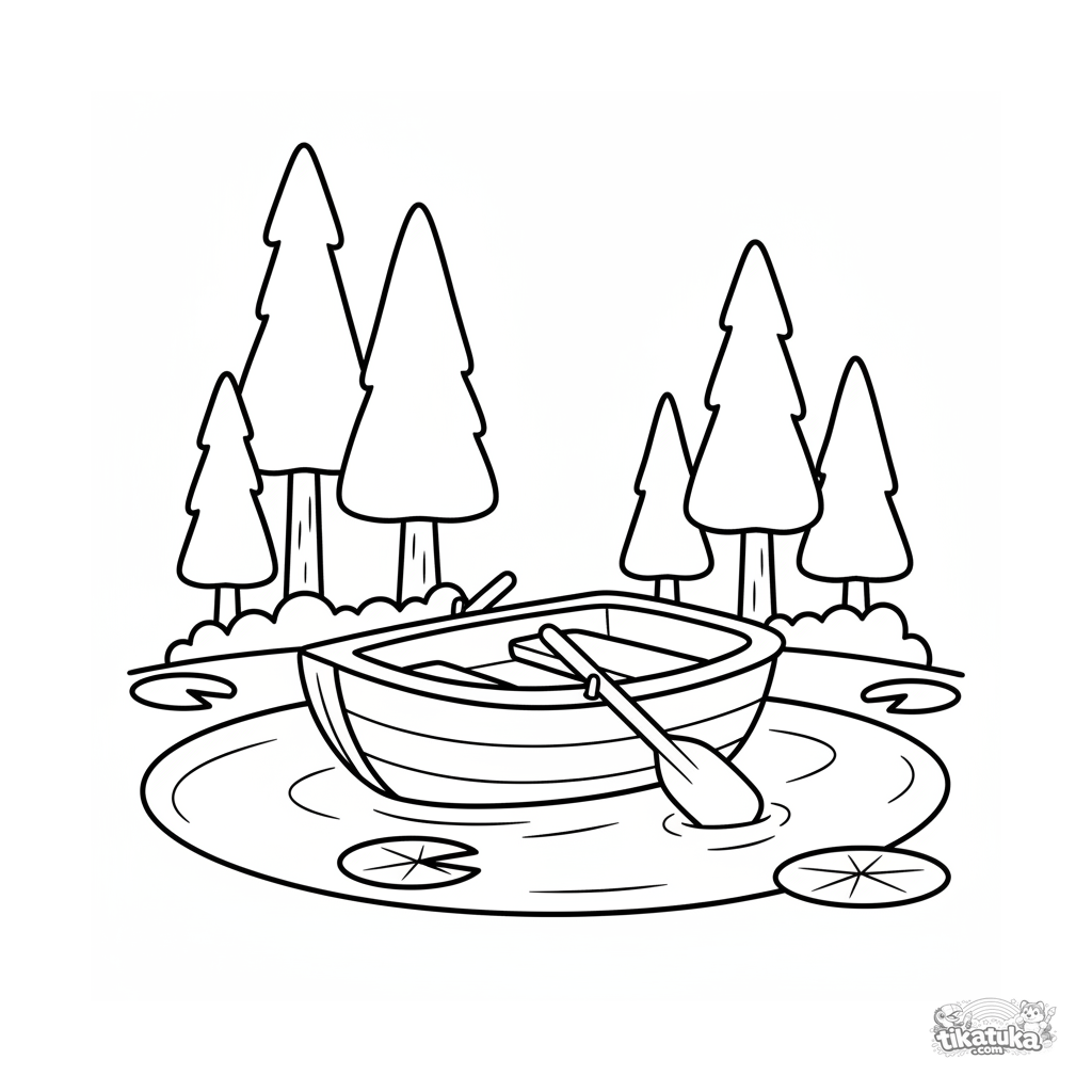 Página para colorear para niños pequeños: un pequeño bote de remos en un lago boscoso y tranquilo. Formas simples y amplios márgenes.