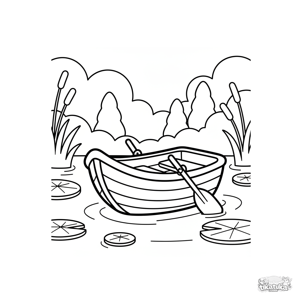 Página para colorear para niños pequeños: un pequeño bote de madera flota en un lago tranquilo y brumoso. Formas simples y amplios márgenes son ideales para primeras experiencias.