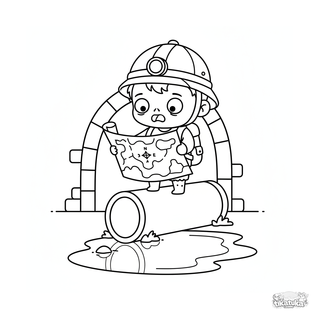 Página simple para colorear para bebés: un pequeño zombi explorador con un mapa en una alcantarilla. Formas grandes, pocos detalles, amplios márgenes.