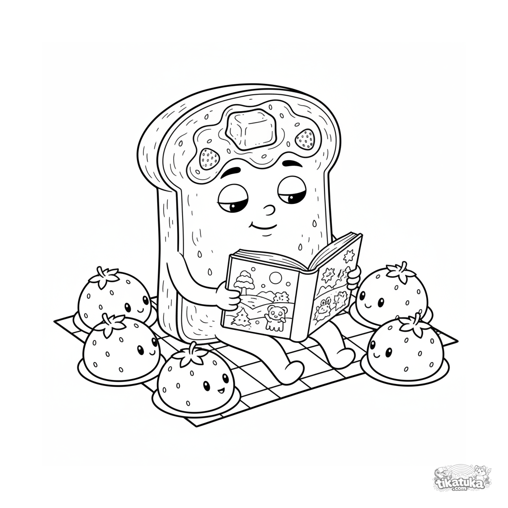 Página para colorear detallada para niños mayores 10-12: una tostada lee un libro a un círculo de mochi de fresa en un picnic. Texturas y atmósfera acogedora.