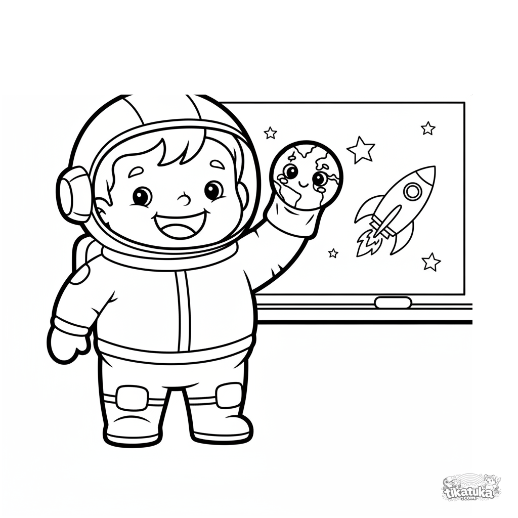 Página para colorear simple para bebés 2-3: un astronauta hace un espectáculo de títeres en la pizarra del aula. Formas grandes y claras, márgenes amplios, personaje amigable.