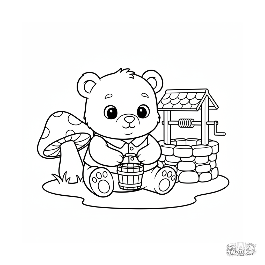 Página para colorear muy simple para bebés 2-3: un tierno osezno con una cubeta junto a un pozo. Formas grandes, contornos gruesos, mínimo detalle.