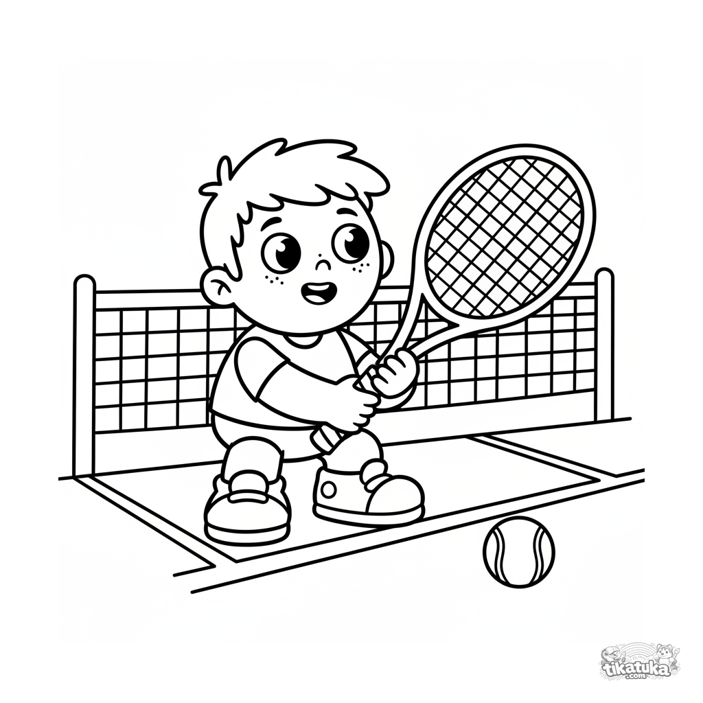 Página para colorear para niños pequeños 2-3 años: un niño mira con asombro una raqueta de tenis enorme. Formas grandes y simples, márgenes amplios.