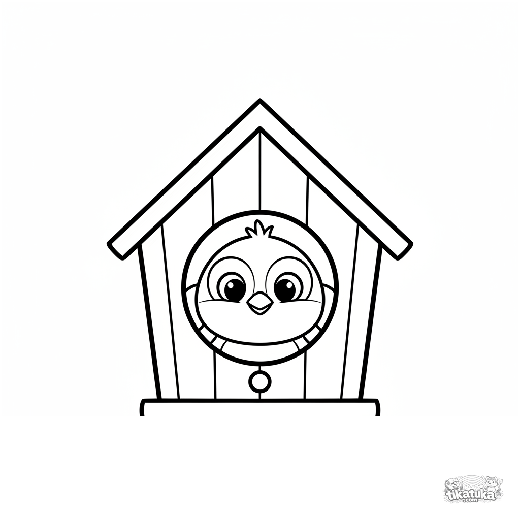 Página para colorear muy simple para niños pequeños 2-3: un lindo azulejo asoma de una caja nido. Formas grandes, contornos gruesos, perfecto para primeros crayones.