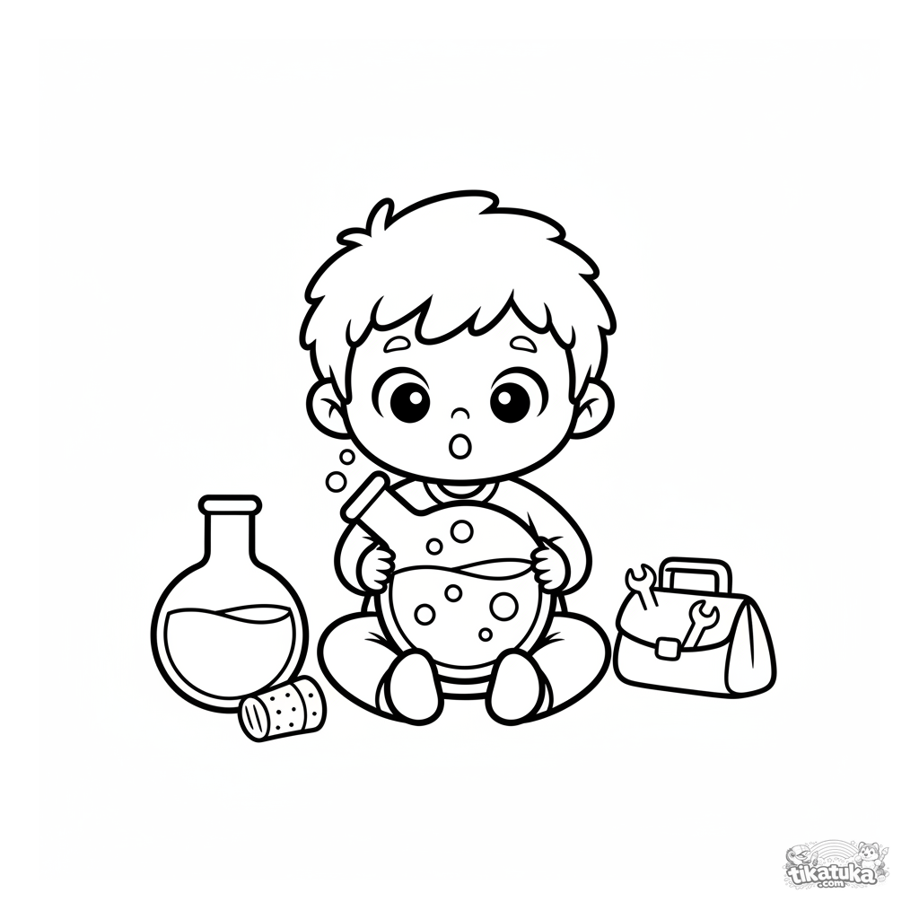Página para colorear simple para niños pequeños 2-3: un niño con un matraz grande de poción burbujeante en un laboratorio secreto.