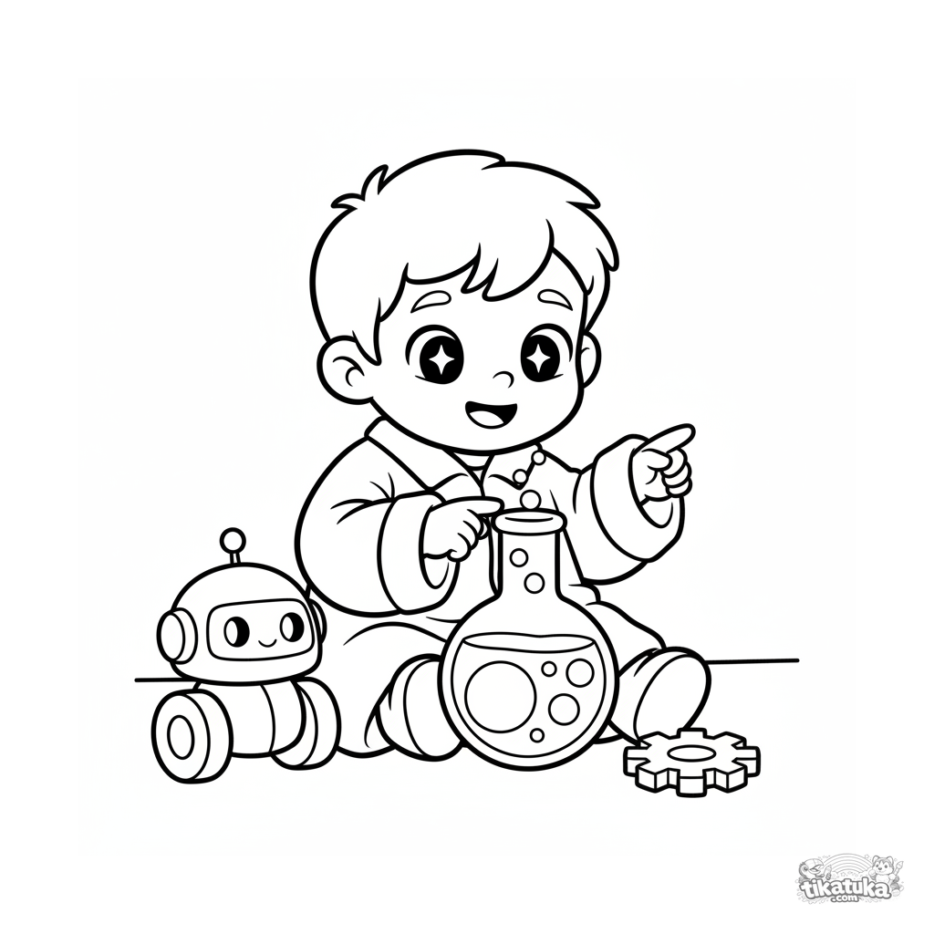 Página simple para colorear para niños 2-3: un niño con bata de laboratorio observa una poción burbujeante en un matraz, con un robot de juguete cerca.