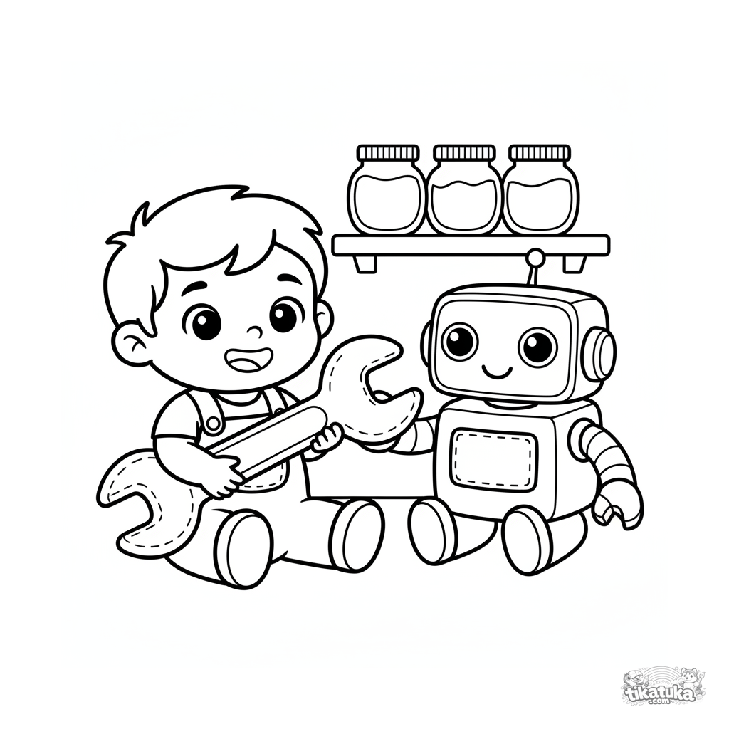 Página para colorear simple para niños pequeños de 2-3 años: un niño en mono y un robot de peluche en un laboratorio secreto. Formas grandes, márgenes amplios.