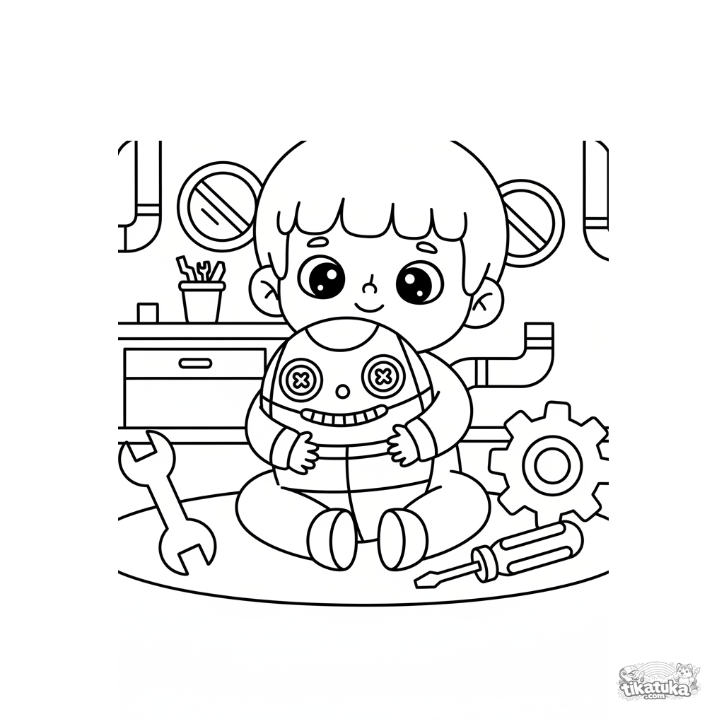 Página para colorear muy simple para niños pequeños de 2-3 años: un niño abraza un robot de peluche grande en un laboratorio secreto. Grandes detalles.