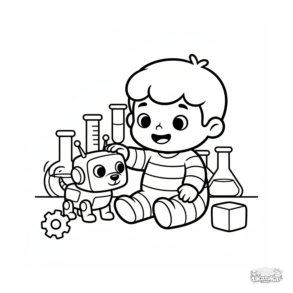 Página para colorear para niños pequeños 2-3: un niño en un laboratorio acariciando un perro robot. Formas grandes y simples, márgenes amplios.