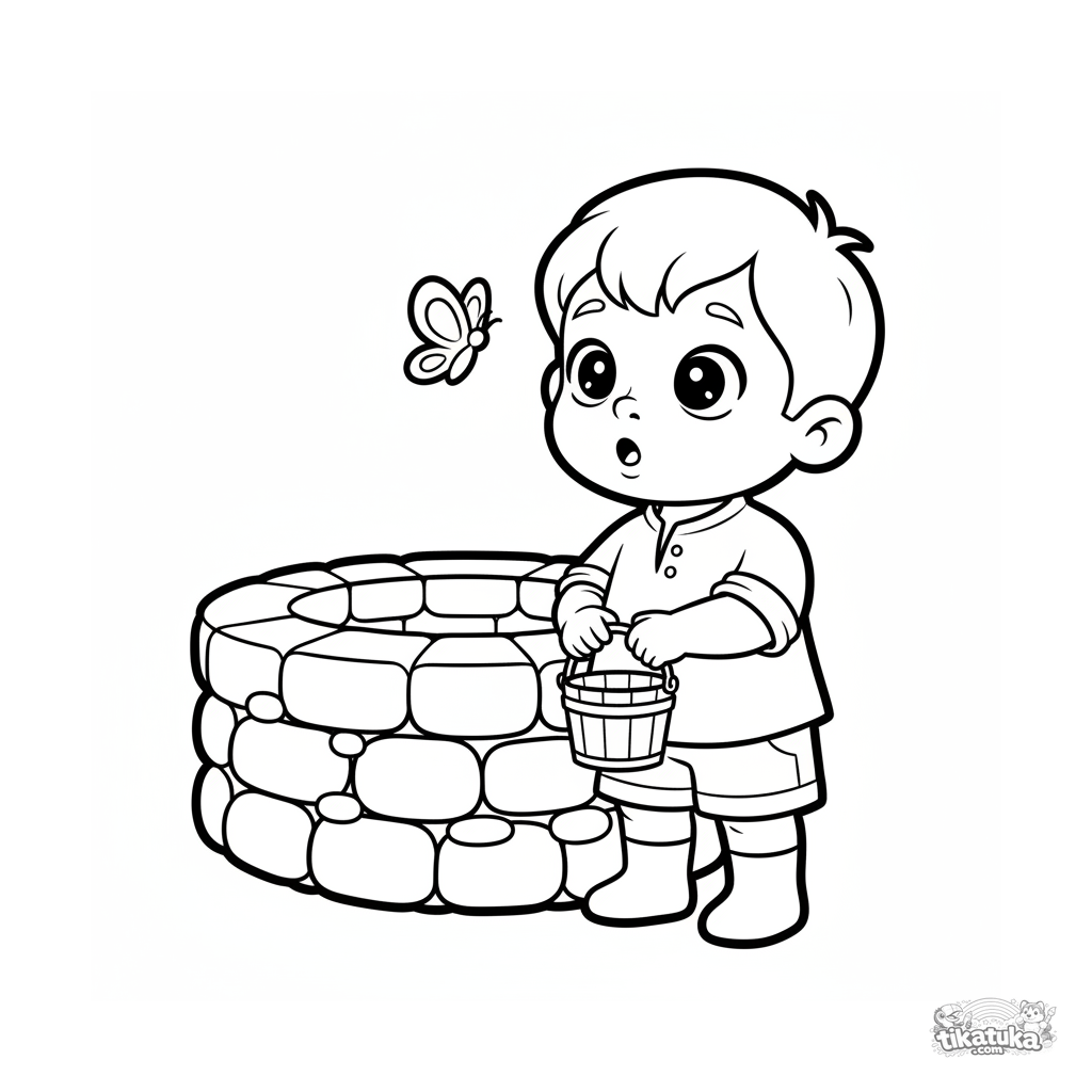 Página para colorear muy simple para niños pequeños 2-3: un niño con un cubito está junto al pozo. Formas grandes y claras, mucho espacio libre para colorear.