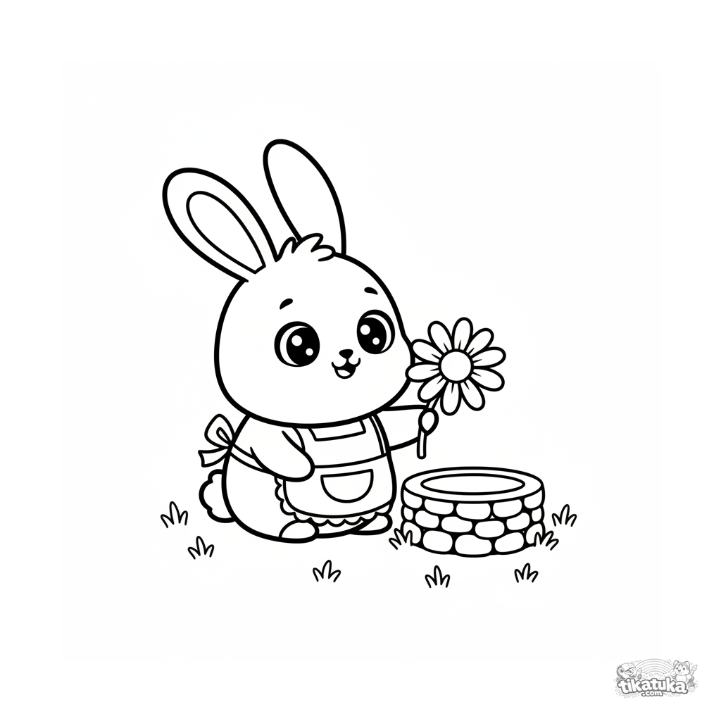 Página para colorear simple estilo chibi para niños pequeños 2-3: un conejito en el pozo sostiene una florecita. Cabeza enorme, cara linda, detalles mínimos.