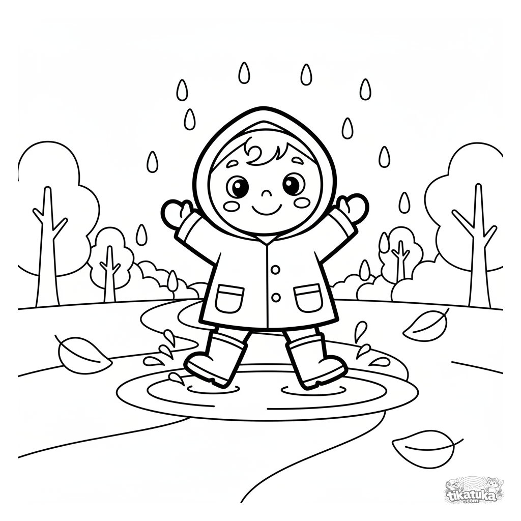 Página para colorear para niños pequeños de 2-3 años: un niño alegre en botas de goma salta en un charco bajo la lluvia otoñal. Formas grandes y simples, márgenes amplios.