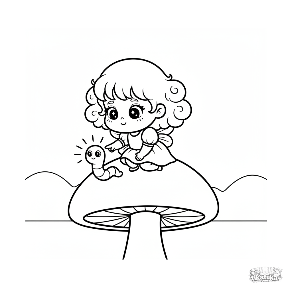 Página para colorear simple para bebés 2-3: una pequeña princesa hada en un hongo conociendo una luciérnaga. Formas grandes y márgenes amplios.