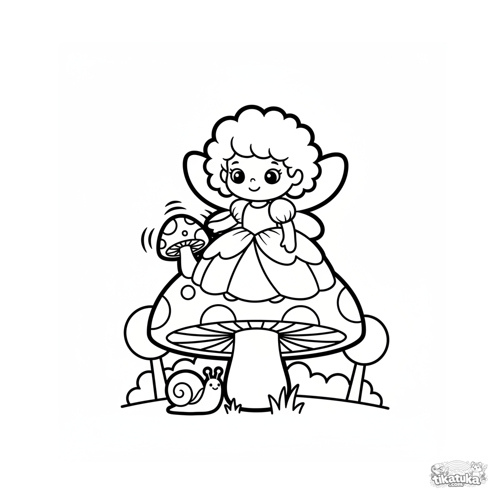 Página para colorear simple para niños pequeños 2-3: una linda princesa hada sobre un hongo en el bosque. Formas grandes y márgenes amplios.