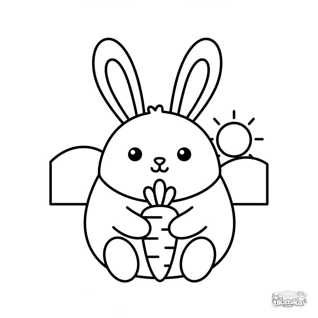 Página para colorear para niños pequeños de 2-3 años: un gran conejo redondo sostiene una zanahoria. Formas grandes y simples, contornos gruesos, perfecto para primeras experiencias con pintura. Página para pintar por números para niños.