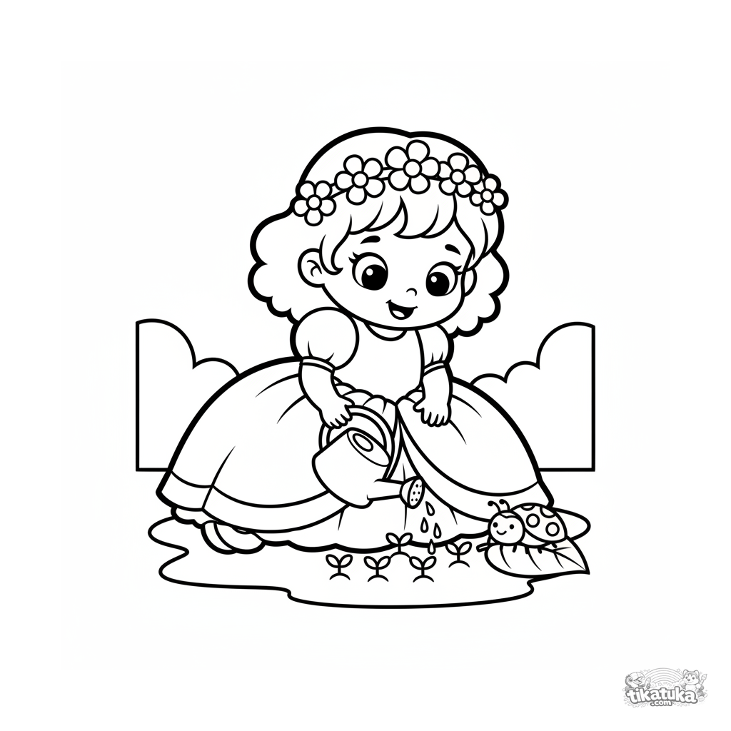 Página simple para colorear para niños pequeños 2-3: una pequeña princesa riega brotes en un jardín. Formas grandes y claras, márgenes amplios.