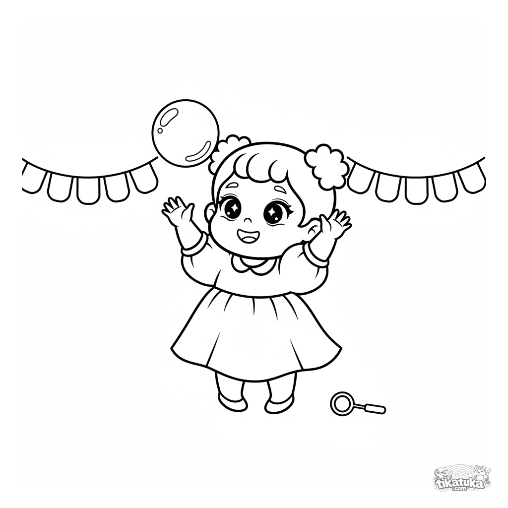 Página para colorear para niños pequeños 2-3 años: una niña pequeña con deleite alcanza una gran burbuja de jabón en un salón festivo. Formas muy simples y grandes.