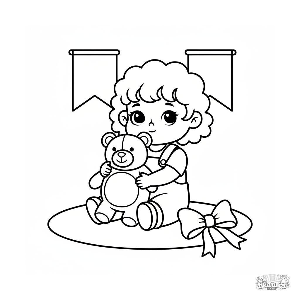 Página para colorear simple para niños pequeños 2-3: una niña abrazando un peluche grande en un salón festivo. Formas grandes.