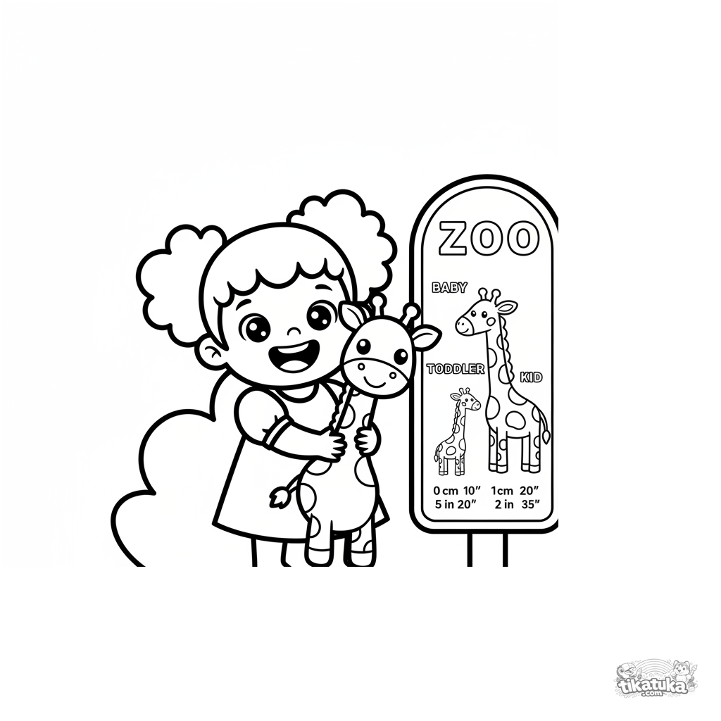 Página simple para colorear para niños pequeños de 2-3 años: una niña abraza un juguete de jirafa en un cartel de altura en el zoológico.
