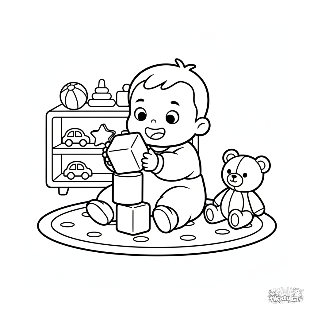 Página simple para colorear para niños de 2-3 años: un niño en el aula apilando una torre de bloques grandes. Formas grandes, un oso de juguete, mucho espacio para colorear.