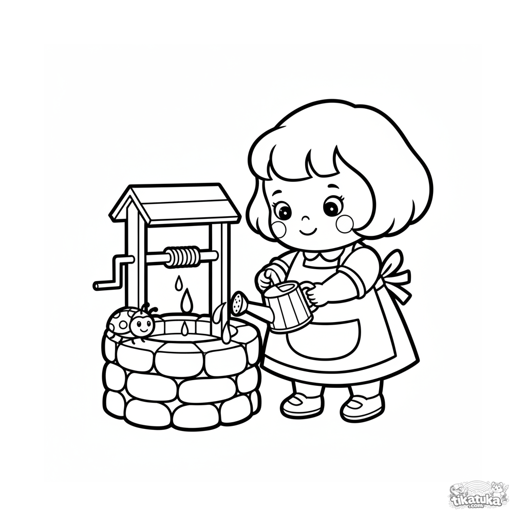 Página para colorear súper simple para niños pequeños 2-3: un niño llena una pequeña regadera desde el pozo. Formas geométricas, detalles mínimos.