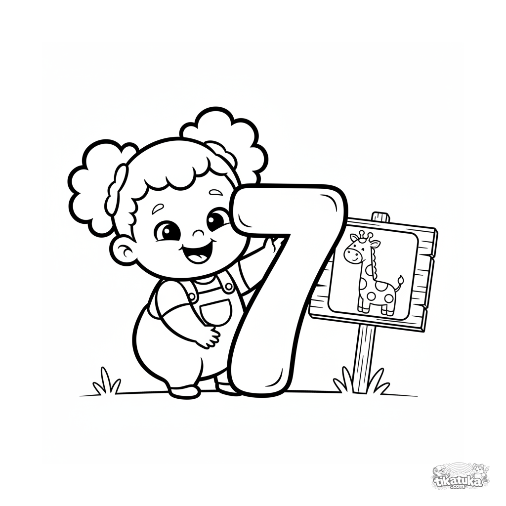 Página para colorear simple para niños pequeños 2-3 años. Un niño riendo abraza un gran número 7 en un cartel que cuenta manchas de jirafa.