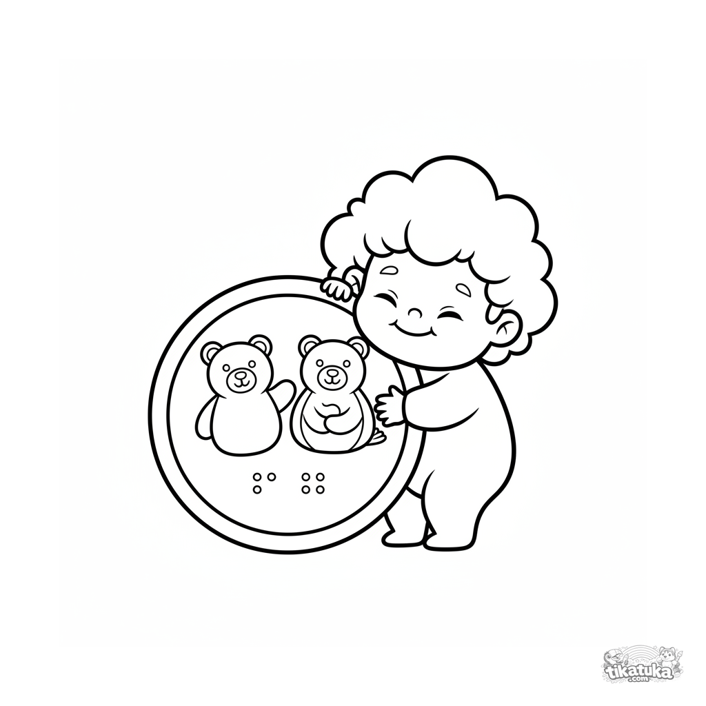 Página para colorear simple para niños pequeños 2-3: un niño abraza un gran cartel táctil de animales en el zoológico. Introduce la inclusividad y las formas.