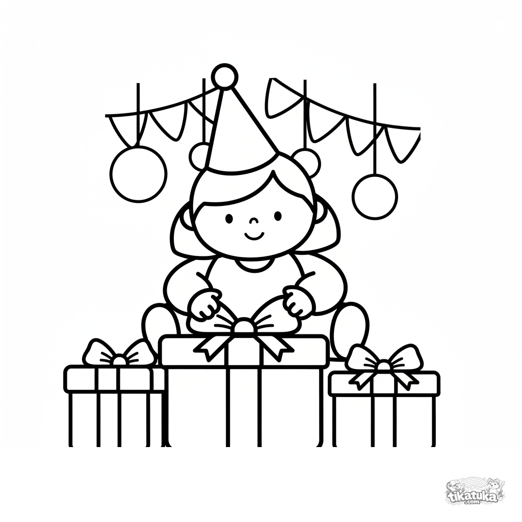 Página para colorear muy simple para niños pequeños 2-3: un niño con gorro de fiesta sentado entre cajas de regalo grandes.