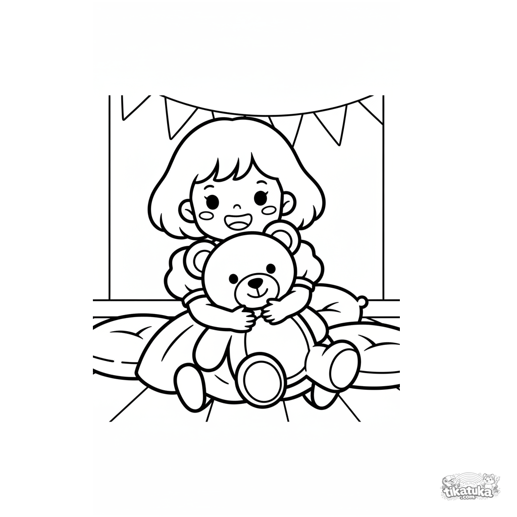 Página para colorear simple para 2-3 años: una niña en un salón festivo abrazando un oso de peluche. Formas grandes, contornos claros, márgenes amplios.