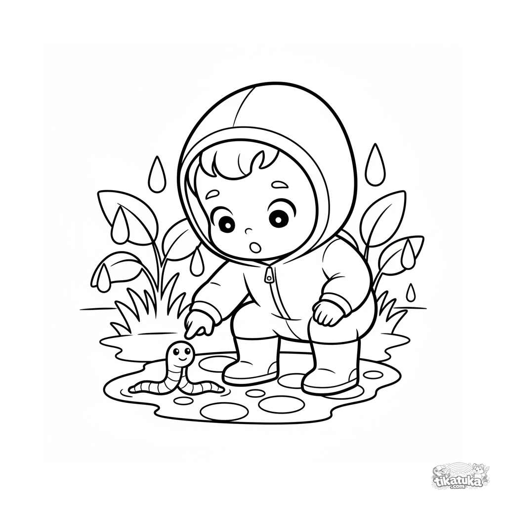 Página para colorear para niños pequeños de 2-3 años: un niño curioso con botas de goma inspecciona un gusano en un camino mojado tras la lluvia de otoño.