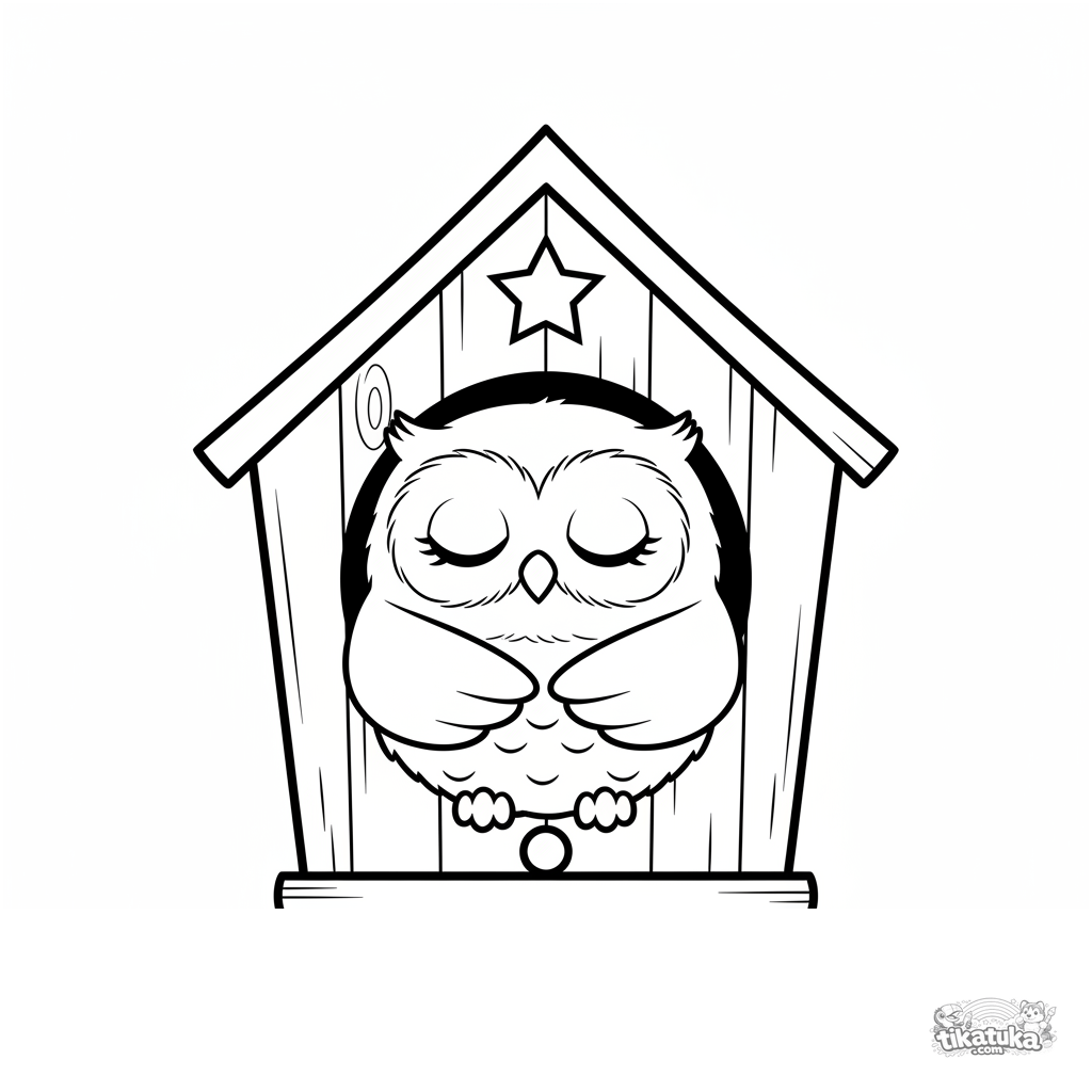 Página para colorear simple para niños pequeños 2-3: un búho bebé esponjoso durmiendo en una casa de pájaros. Formas grandes y claras, márgenes amplios.