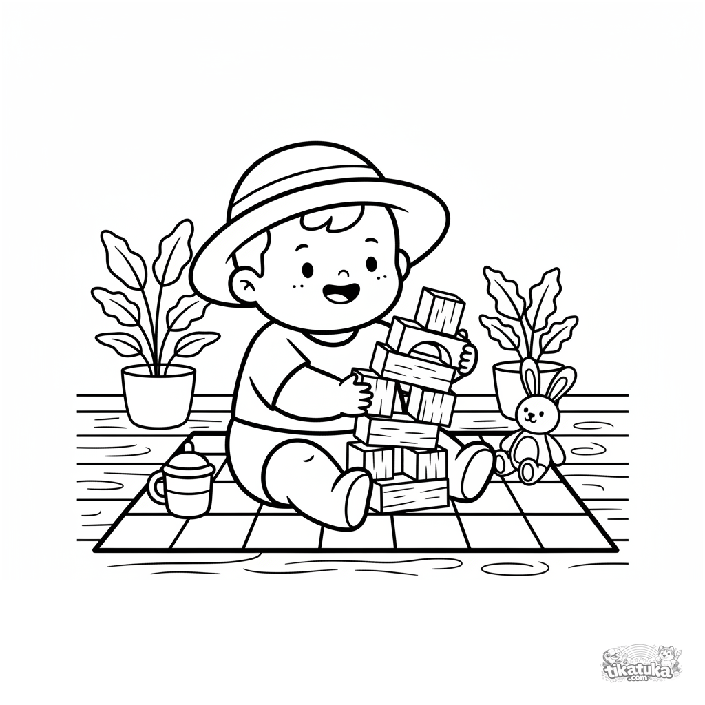 Página para colorear muy simple para bebés 2-3 años: niño construye torre de bloques en el porche. Formas grandes y claras.