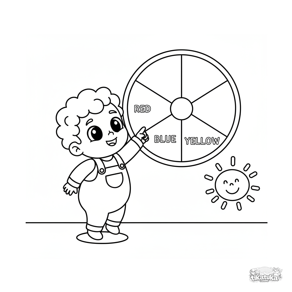 Página para colorear muy simple para bebés de 2-3 años: un niño en una gran rueda de colores en la pared de la zona de bebés del zoológico. Formas grandes y claras.