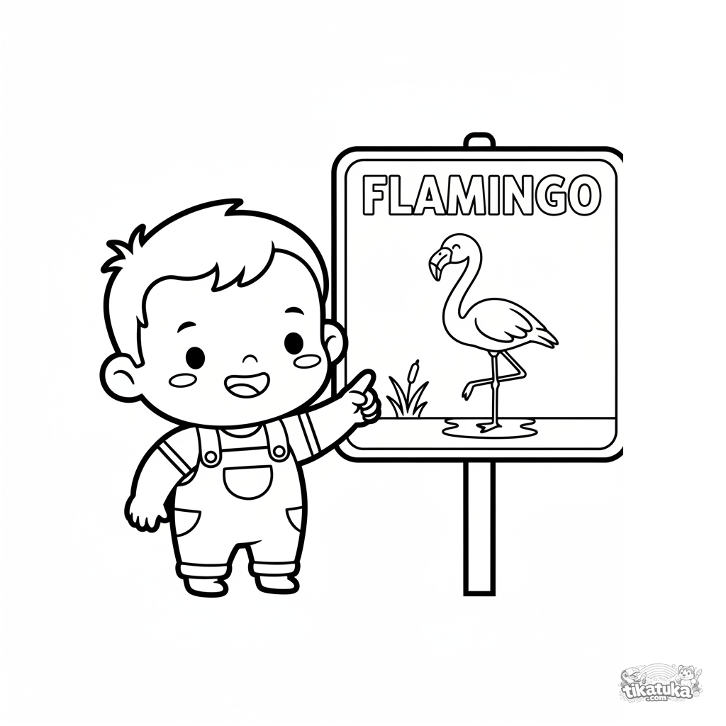 Página para colorear simple para niños pequeños de 2-3 años: un niño señala un gran cartel de flamenco en el zoológico. Formas grandes, márgenes amplios.