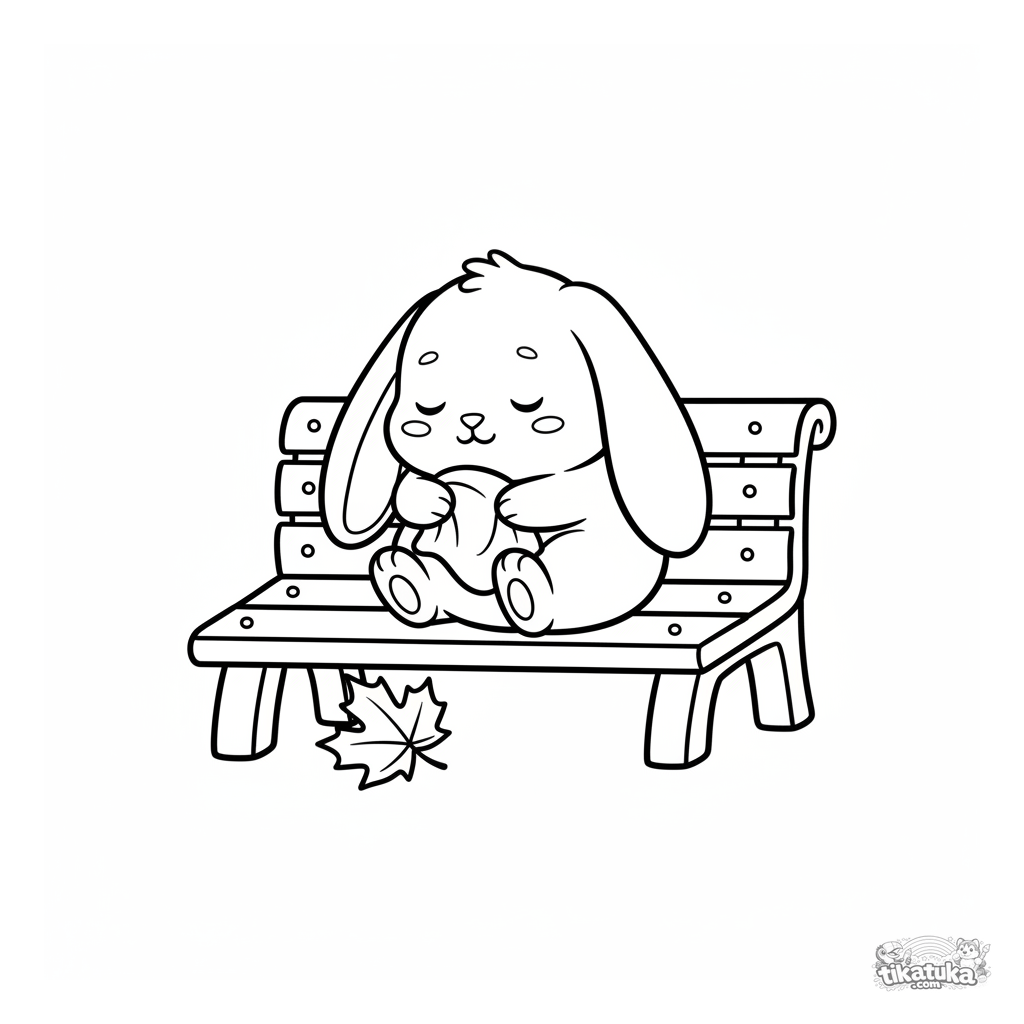 Página simple para colorear para bebés 2-3: un conejo tierno durmiendo en un banco del parque. Formas grandes.